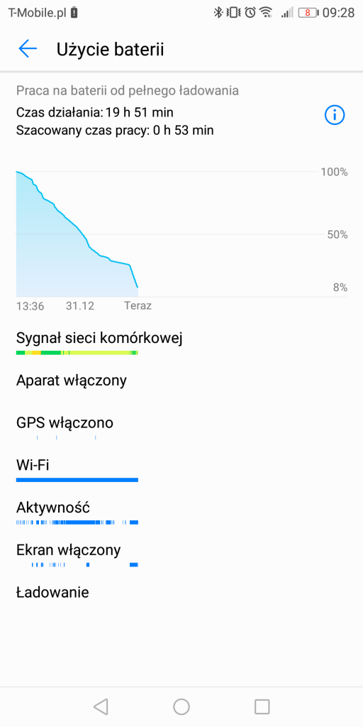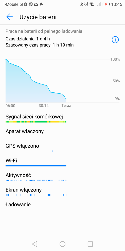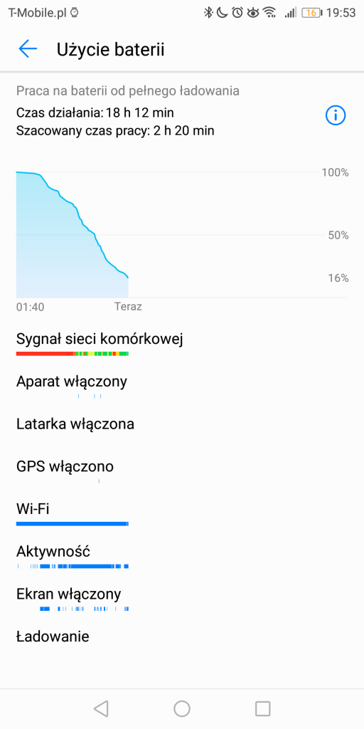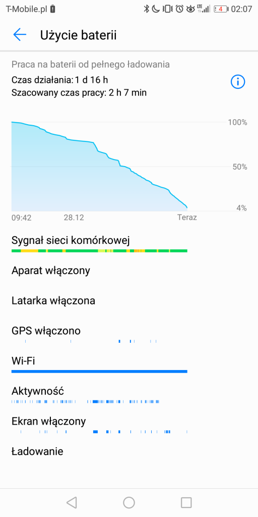 W zasięgu Huawei Mate10 Lite na jednym ładowaniu baterii, jest blisko jedna, godzinowa doba, chociaż raz dojechałem do ponad 1,5 dnia! Czas działania smartfonu wynosił jednak zazwyczaj około – lub nieco ponad – 20h. W rezultacie dawało to realnie dobre 4h pracy włączonego ekranu (SoT). Oczywiście to wyniki, które są zależne od faktycznego użycia, ale średnia tak mniej więcej się kształtuje. Szczerze? Powalony nie jestem… Tym bardziej, że Mate10 Lite jest dobrym punktem odniesienia dla tego, jak sprawuje się na jednym ładowaniu HTC U11 Life. Pomimo bowiem, że jest w nim bateria o pojemności 2600mAh, to wykręca na tym tle niezłe wyniki (a momentami nawet takie same), jak Mate10 Lite, w którym producent zastosował ogniwo 3340mAh! Pod recenzją smartfonu HTC wiele osób – pomimo zachwalanego przeze mnie akumulatora w tym telefonie (co poparłem zrzutami ekranu z czasu pracy), przekreślało tę słuchawkę z uwagi na baterię. A tutaj niespodzianka – dużo pojemniejsze ogniwo – potrafi dawać nawet 1h przewagi w SoT, aniżeli uboższy pod kątem mAh konkurent, ale i tak wypada on w tym zderzeniu bardzo dobrze!