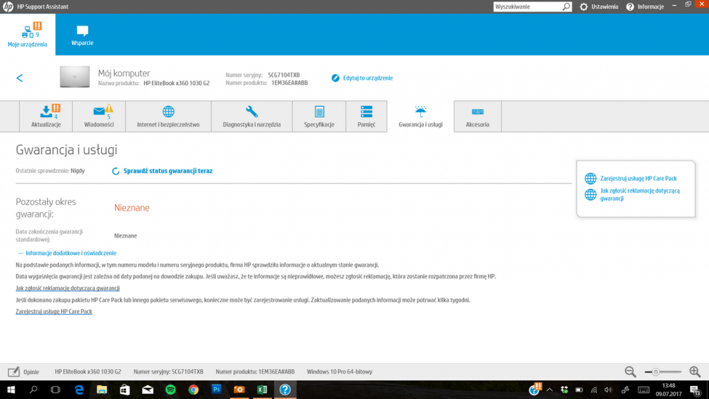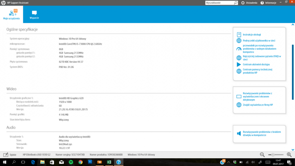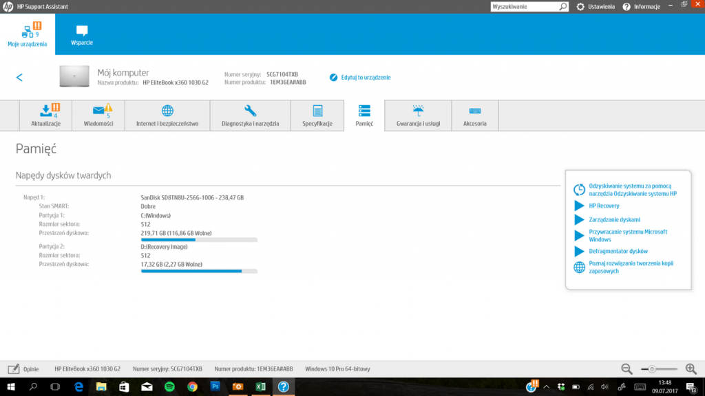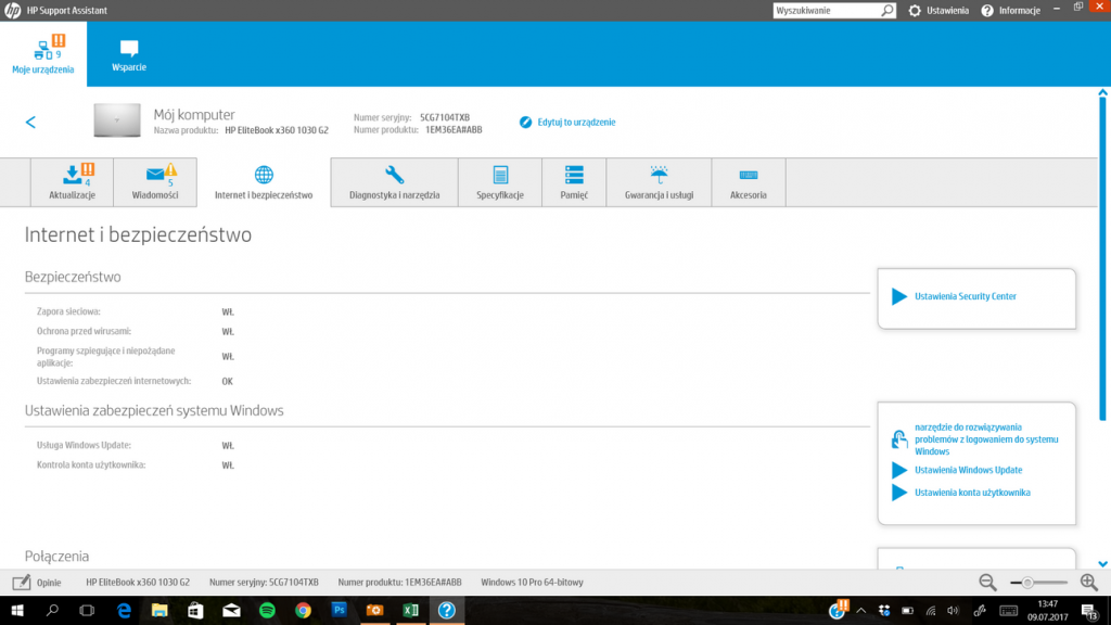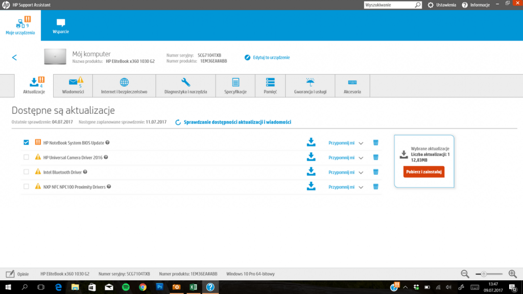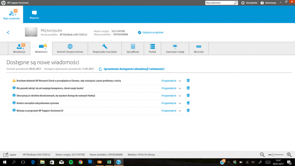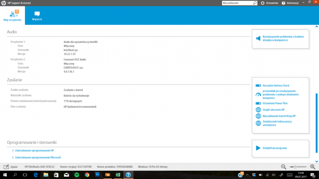 Na starcie HP nie narzuca na szczęście milionem aplikacji i programów, co często w przeszłości się zdarzało. Bardzo tego nie lubiłem. HP daje za to od siebie bardzo dobre centrum dowodzenia komputerem, jakim jest HP Support Assistant. W klarowny sposób przedstawia wszystkie najważniejsze informacje na temat używanego sprzętu. Nie musisz na przykład pamiętać, do kiedy obowiązuje Cię gwarancja – taka informacja znajduję się właśnie w Asystencie. Podobnie sprawa wygląda przy aktualizacjach sterowników, czy programów. Gdy tylko komputer wykryje, że Twoje oprogramowanie jest nieaktualne, otrzymasz odpowiedni komunikat i za pomocą HP Support Asistant szybko dokonasz niezbędnych instalacji. Takie rozwiązanie bardzo ułatwia życie zwykłemu użytkownikowi, a tym bardziej użytkownikowi biznesowemu, który nie ma czasu na przeszukiwanie stron producentów w celu uzyskania odpowiednich sterowników. Wszystko podane jest jak na tacy. Wystarczy zatwierdzić i można instalować!