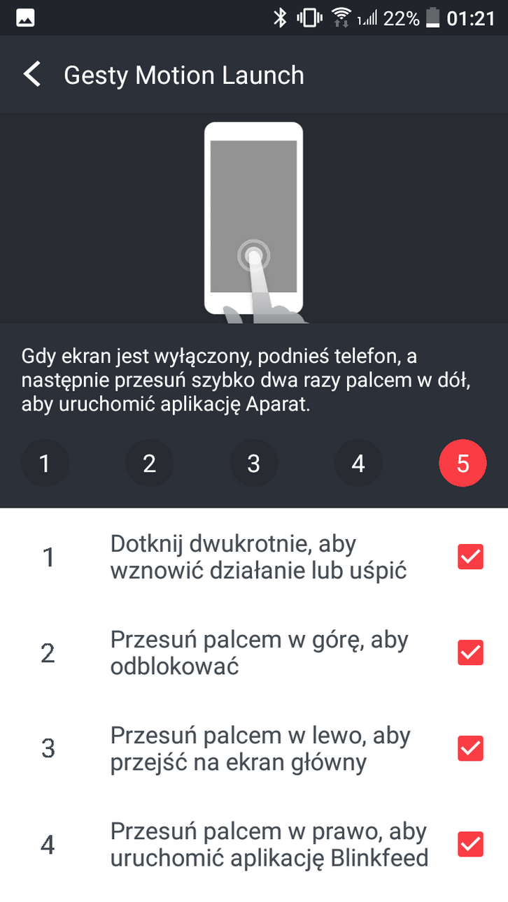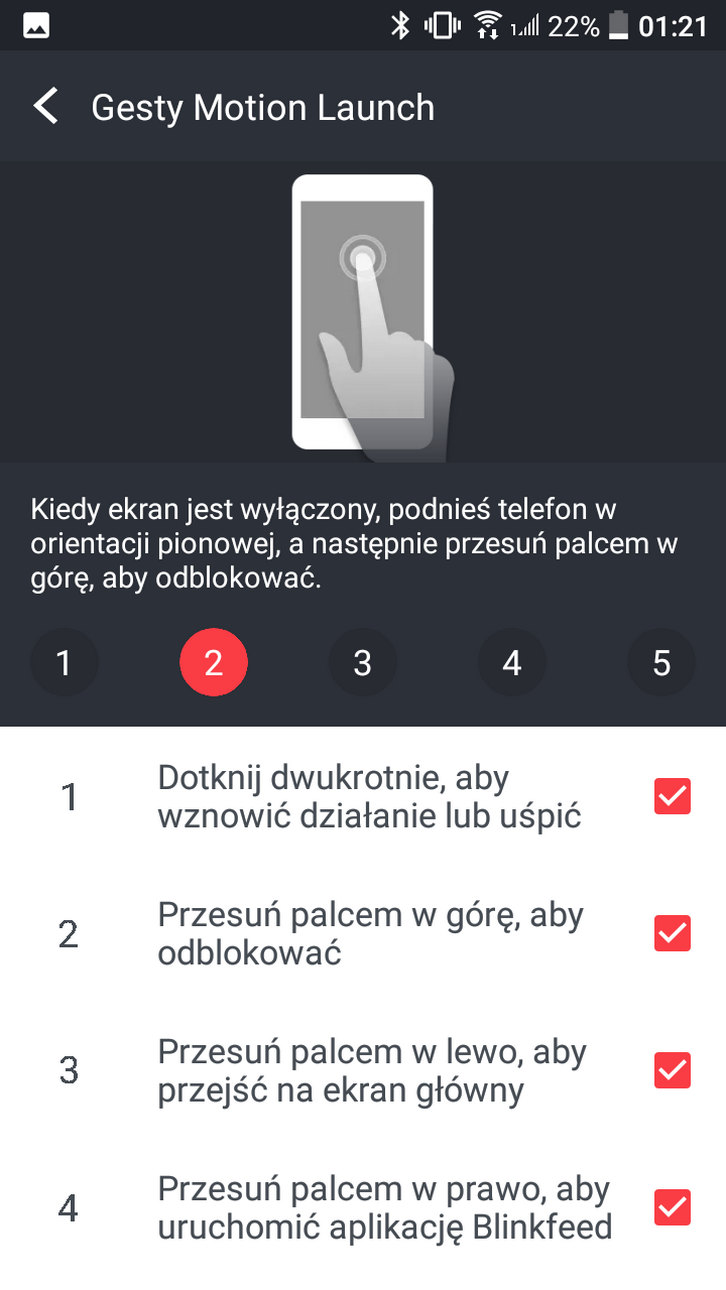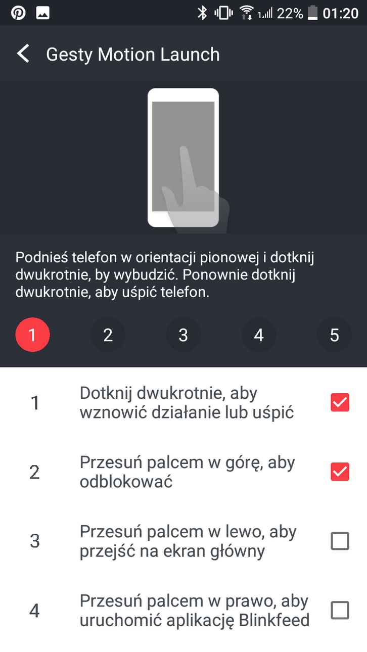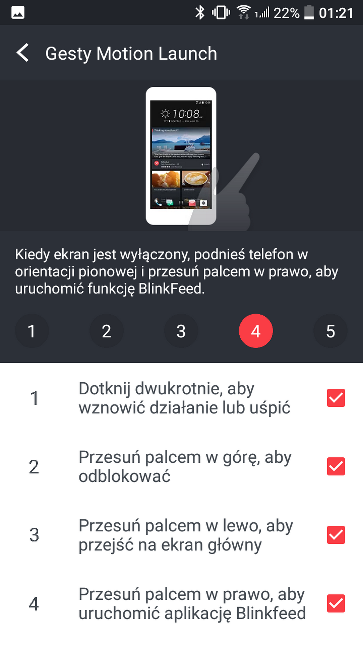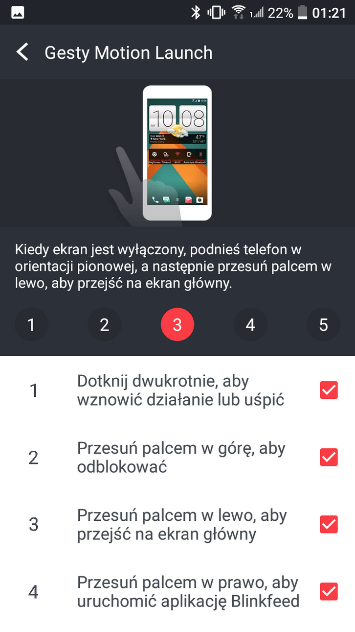 HTC wyposażył smartfon w gesty Motion Launch. Polegają one na tym, że przy odblokowywaniu ekranu w zależności od ruchu Twojego palca, będziesz mógł/mogła uaktywnić żądaną akcję. I tak np. przy jego przesunięciu w prawo – od razu uruchamia się aplikacja Blinkfeed, zaś ruch palca w lewą stronę – skieruje Cię na główny ekran. Szkoda, że nie mamy większego wpływu na personalizację. Osobiście nie korzystałem z tych gestów. Nie przychodziło mi to naturalnie, ale komuś może to przypaść do gustu.
