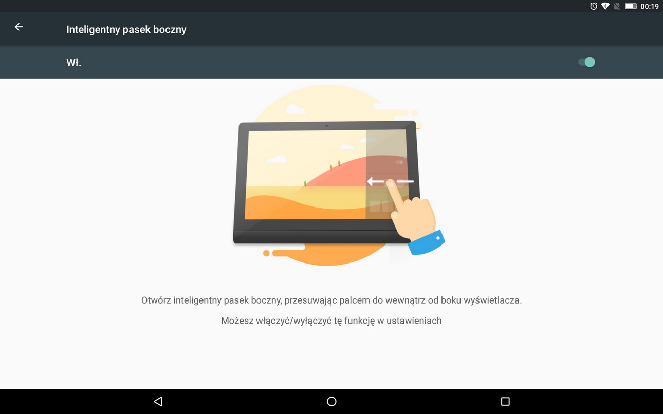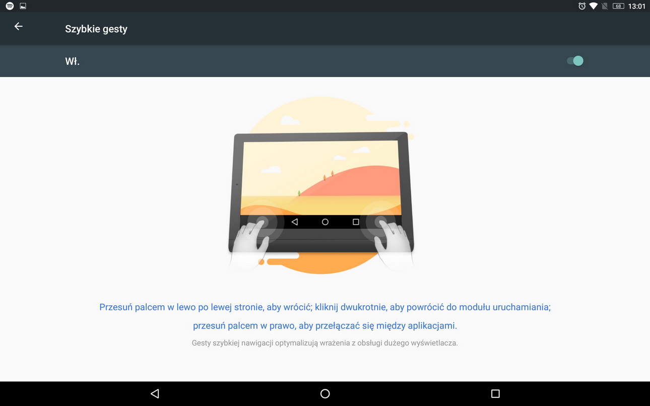 Pierwsza z nich to „Szybkie gesty”. Kiedy po raz pierwszy zobaczyłem tę funkcję pomyślałem, że tablet umożliwi mi serię różnych gestów, które na przykład odpowiednim ruchem ręki, czy palca uruchomią daną aplikację, aparat czy też pozwolą na zrobienie zrzutu ekranu. Srodze się zawiodłem, kiedy okazało się, że za tym kryją się tak naprawdę tylko trzy czynności… Oparte są na przesunięciu palcem po dolnym pasku nawigacyjnym, np. wykonanie po nim ruchu po prawej stronie pozwala na… przełączanie się pomiędzy aplikacjami. No właśnie, czy aby przypadkiem nie jest to zdublowana funkcja, jaką pełni symbol kwadratu? Przesunięcie palcem po prawej stronie paska w tym wypadku tak naprawdę robi dokładnie to samo. Po co zatem ta dodatkowa funkcja? Ja nie widzę w tym żadnego praktycznego zastosowania.