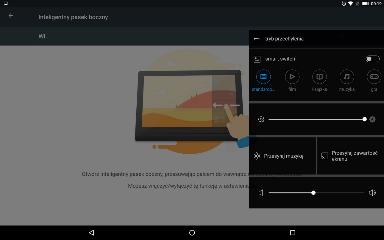 Drugi ficzer, to „inteligentny pasek boczny„. W moim mniemaniu powinno się to nazywać po prostu „pasek boczny”, bo nie widzę w tej opcji żadnej inteligencji. Pomijając już to, pozwala Ci na wysunięcie dodatkowego menu, w którym możesz na przykład… rozjaśnić obraz, albo wyregulować głośność. Ewentualnie zmienić tryb, w jakim działa dźwięk. Po co? Czy przypadkiem nie mam tego w górnym pasku powiadomień? Jaki, jest więc sens w dublowaniu tej funkcji?