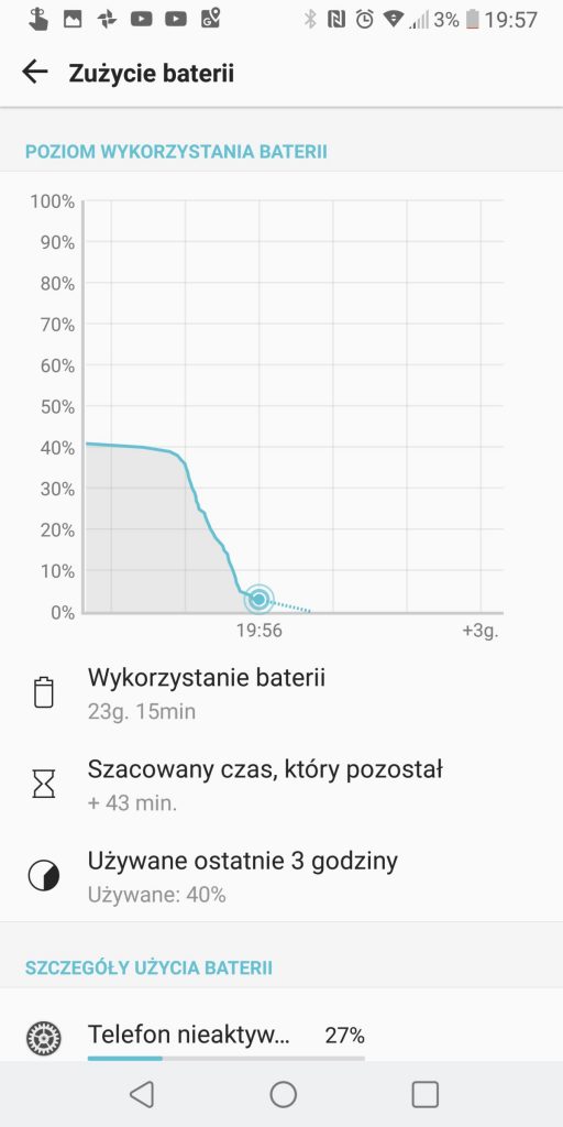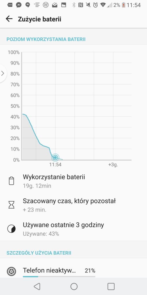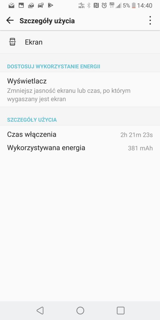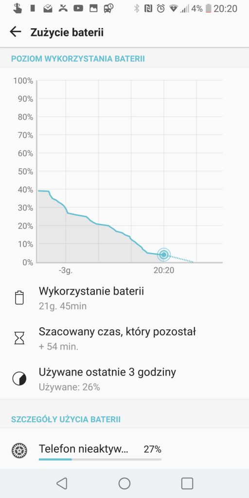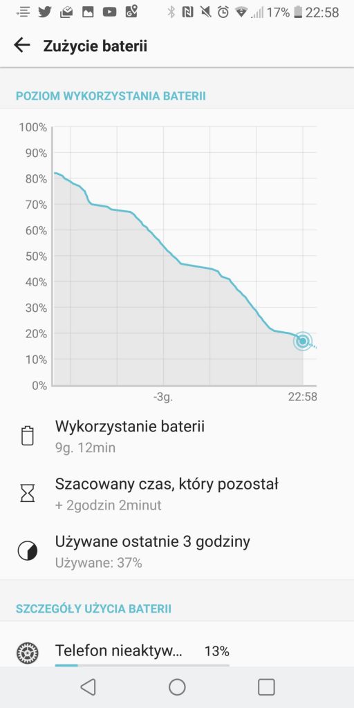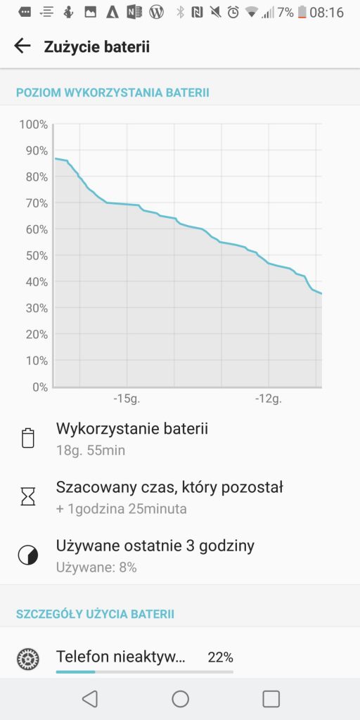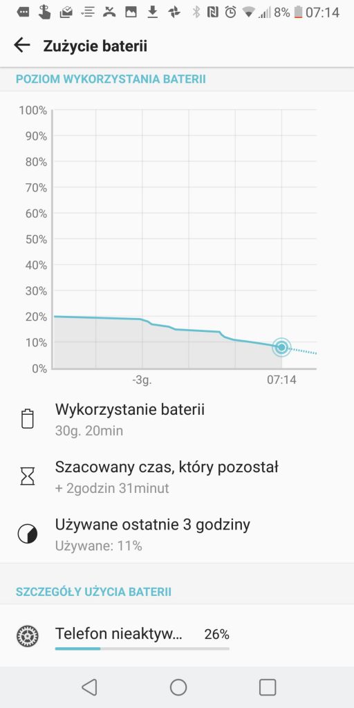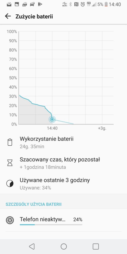 Jak na tak mobilny i innowacyjny kombajn, jest całkiem nieźle. Tym bardziej – co też widać na zamieszczonych przeze mnie zrzutach ekranu – realny czas działania smartfonu zawsze był bliski lub przekraczał czas 24h. Masz więc gwarancję, że na pełnym gazie pojedziesz z V30 przez całą godzinową dobę. W praktyce – jak odłączysz smartfona o godzinie siódmej rano od ładowarki, to następnego dnia o mniej więcej tej samej godzinie podepniesz go ponownie.