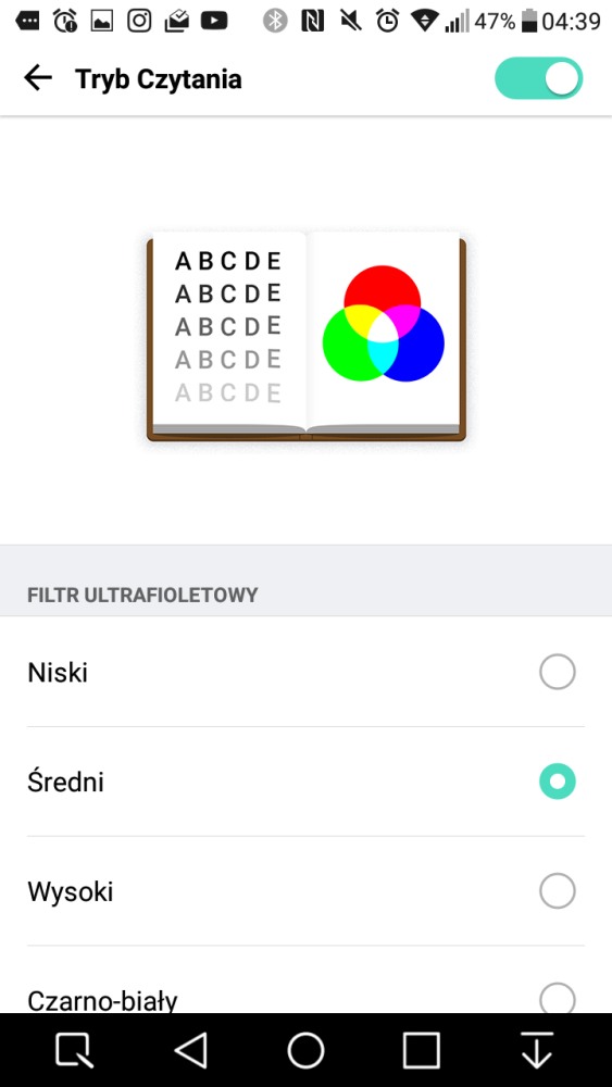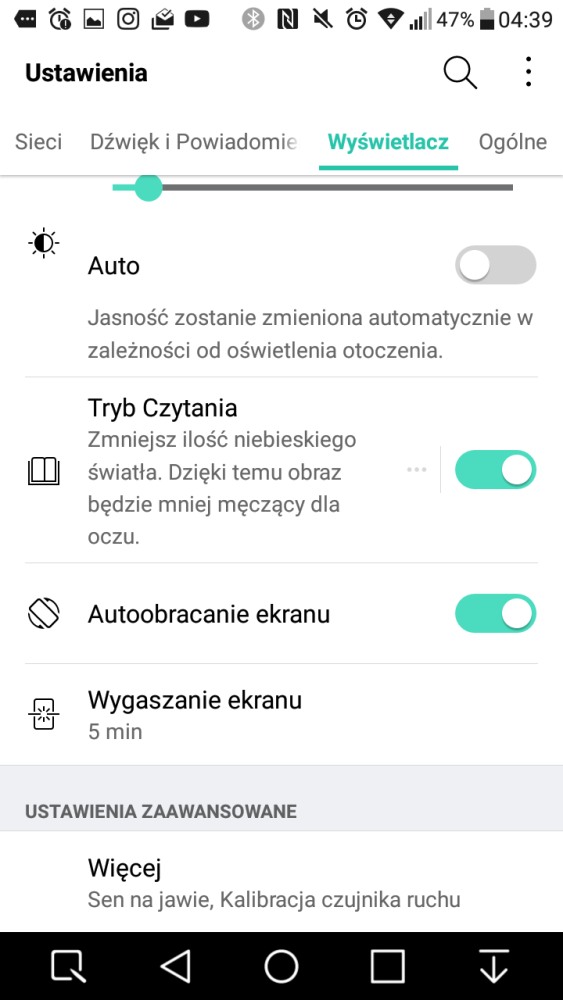 - Ekran – tutaj dostosujesz jasność wyświetlacza (automatyczna lub ręczna), a także włączysz Tryb Czytania niwelujący ilość emitowanego niebieskiego światła, tak by oszczędzić oczom zmęczenia.