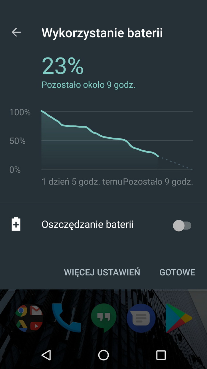 3000 mAh pojemności baterii – to dobra podstawa do tego, by spokojnie móc korzystać ze smartfona przez 24 godziny. Mi zdarzało się czasami dotrwać nawet do około 1,5 dnia, ale przyznaję, że wówczas mniej korzystałem z telefonu. Na koniec dodam, że Moto G5 Plus nie ma problemu z nadmiernym grzaniem i temperaturą, co było przyjemnym zaskoczeniem, szczególnie ze względu na metalową obudowę. Z odprowadzaniem ciepła poradzono sobie jednak bardzo dobrze i nie odczujesz praktycznie żadnego dyskomfortu.