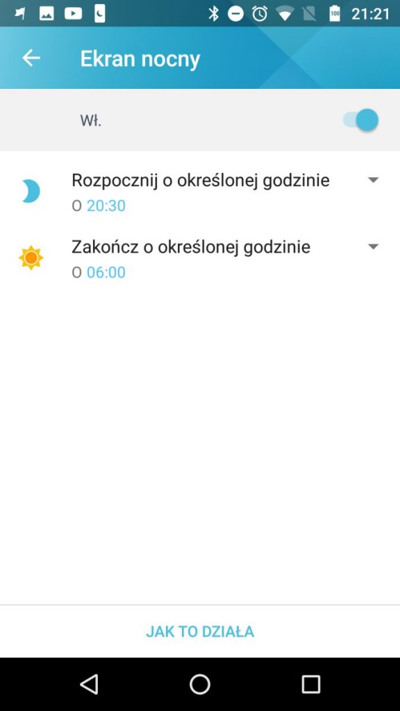 Jedyny minus, który tutaj zauważyłem, to brak możliwości wyregulowania siły kolorystyki cieplnej Ekranu Nocnego, przez co ów redukcja wydawała mi się za słaba, jak na moje potrzeby. Lubię kiedy ekran jest niemal pomarańczowy – w Moto G5s było zdecydowanie mniej intensywnie.