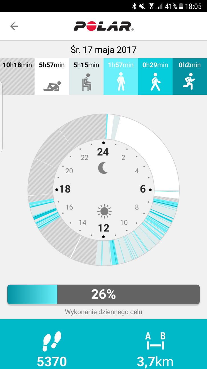 Zacznę od aplikacji mobilnej. Przede wszystkim jest ona bardzo czytelna, szybko znajdziesz potrzebne informacje. Całodobowa aktywność przedstawiona jest za pomocą koła, na którym widać co robiłeś/-aś przez cały dzień. Mnie najbardziej przeraził czas, jaki spędzałem w ciągu dnia na siedzeniu, czego zwyczajnie zazwyczaj się nie czuje będąc na przykład w pracy. No, ale kiedy zsumuje się wszystkie wyniki czasu spędzonego przed komputerem w biurze, czy nawet w domu, robi się naprawdę zaskakująco! Aż nie potrafię sobie wyobrazić, że są ludzie, którzy tylko przesiadają się z fotela biurowego do fotela w aucie, a potem z samochodu na kanapę w domu. Koszmar! I Polar Flow czerpiąc dane ze smartwatcha M600 wszystkie dane o aktywności ten horror potrafi pięknie wizualizować.