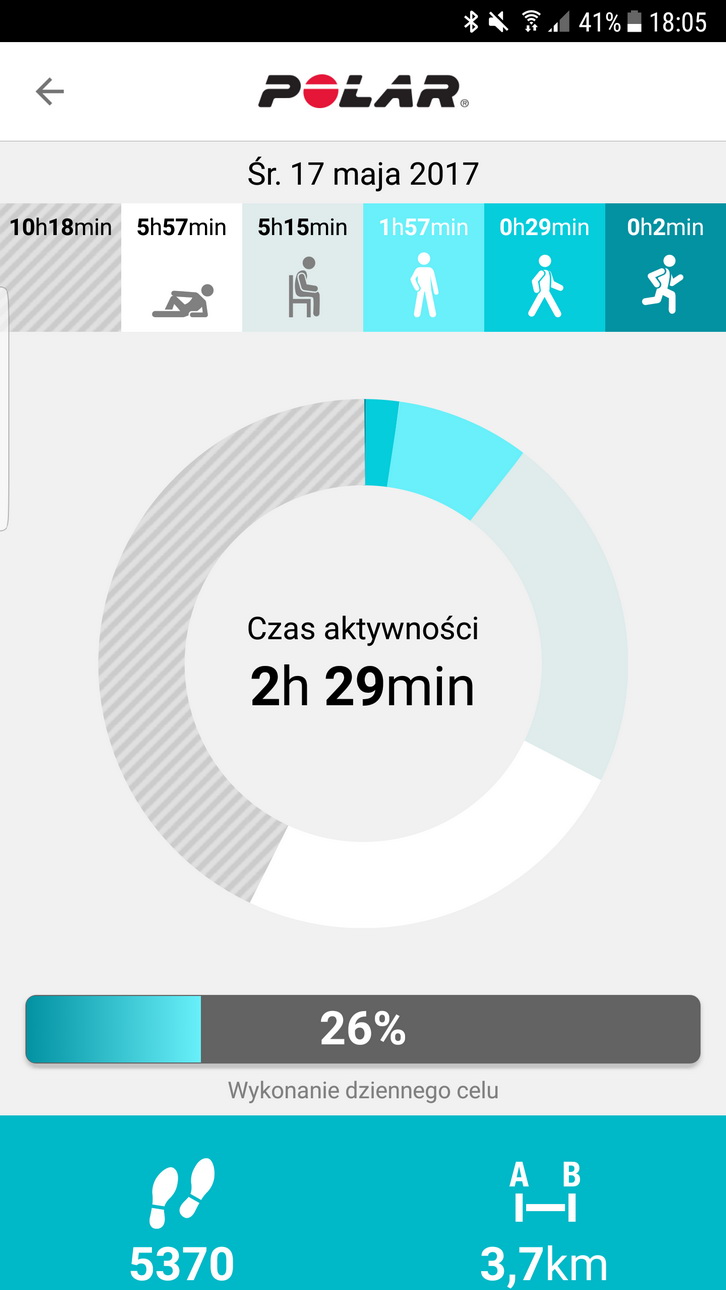 Zacznę od aplikacji mobilnej. Przede wszystkim jest ona bardzo czytelna, szybko znajdziesz potrzebne informacje. Całodobowa aktywność przedstawiona jest za pomocą koła, na którym widać co robiłeś/-aś przez cały dzień. Mnie najbardziej przeraził czas, jaki spędzałem w ciągu dnia na siedzeniu, czego zwyczajnie zazwyczaj się nie czuje będąc na przykład w pracy. No, ale kiedy zsumuje się wszystkie wyniki czasu spędzonego przed komputerem w biurze, czy nawet w domu, robi się naprawdę zaskakująco! Aż nie potrafię sobie wyobrazić, że są ludzie, którzy tylko przesiadają się z fotela biurowego do fotela w aucie, a potem z samochodu na kanapę w domu. Koszmar! I Polar Flow czerpiąc dane ze smartwatcha M600 wszystkie dane o aktywności ten horror potrafi pięknie wizualizować.