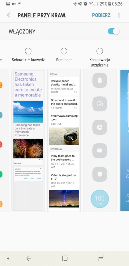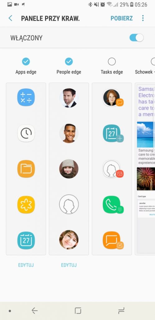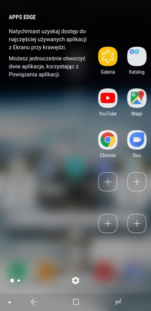 8. Ekran krawędziowy znajduje się bezpośrednio przy prawej krawędzi panelu. Aby do niego przejść należy przesunąć od skraju ów krawędzi palcem. Wówczas pojawi się sekcja tzw. App Edge, czyli najczęściej używanych aplikacji. Oczywiście przesuwając dalej palcem, tak jakby przewijało się poszczególne pulpity na ekranie głównym, przeskakuje się po kolejnych opcjach Ekranu krawędziowego. Tutaj drugą pozycją jest People Edge, czyli sekcja z najchętniej wybieranymi kontaktami. Jeśli wybierzesz ikonę zębatki, to wejdziesz do ustawień Panelu Przy Krawędzi. Można z tego miejsca dodać kolejne segmenty, jak – agregator newsów sportowych, finanse, pogodę, skrót do Konserwacji Urządzenia, dostęp do schowka, Kalendarz, pozycje rysikowe Inteligentnego wyboru etc. Tyle z domyślnych propozycji Samsunga. W Galaxy Apps znajdziesz całą masę (również płatnych) apek, które rozwijają możliwości Ekranu krawędziowego.