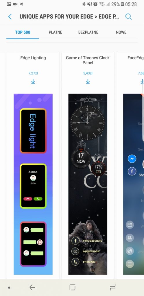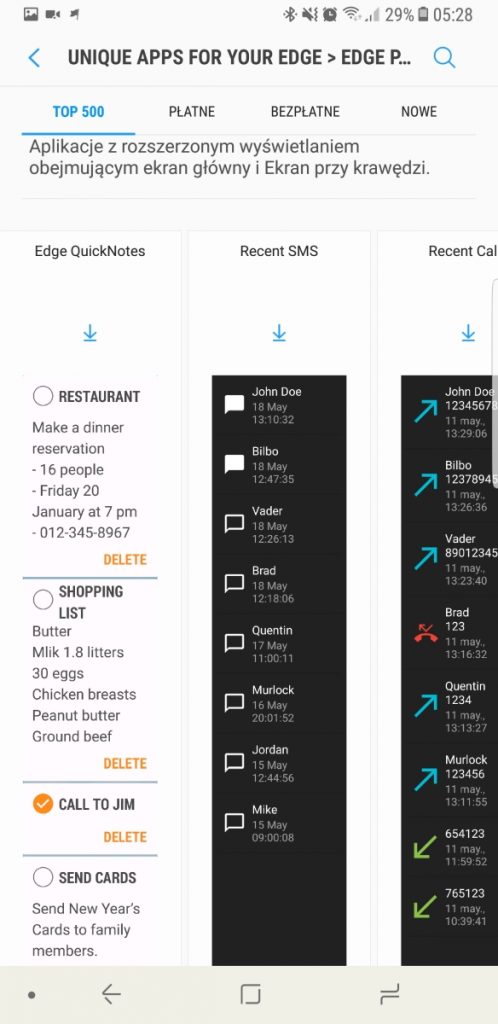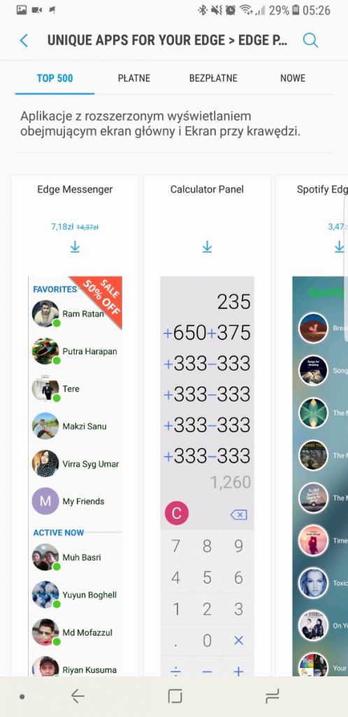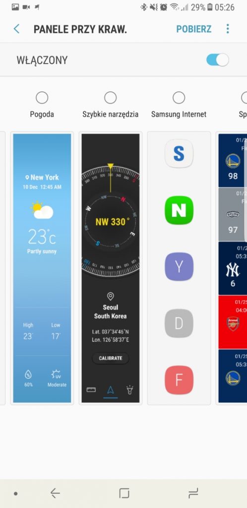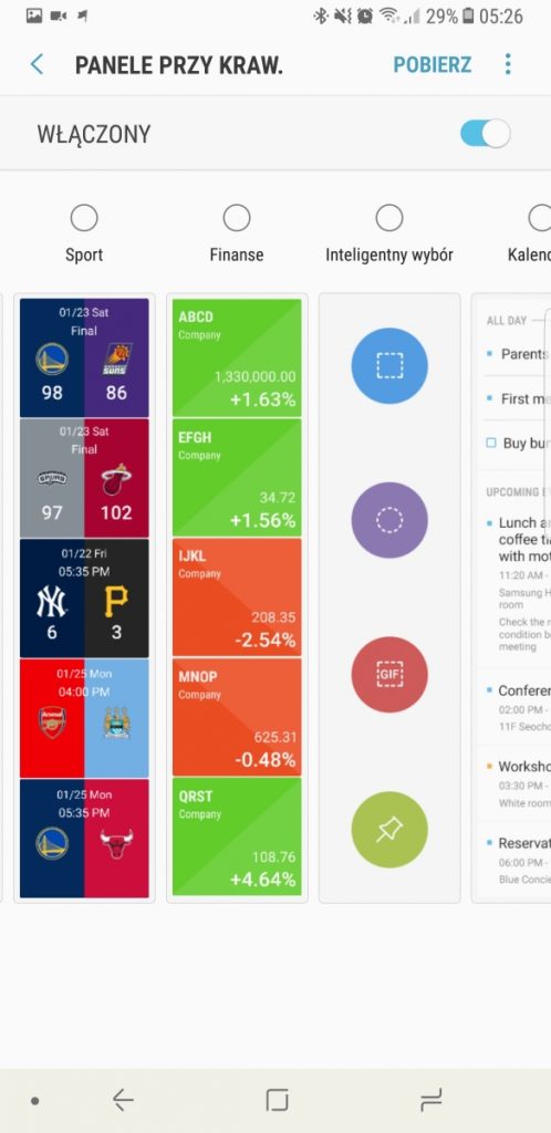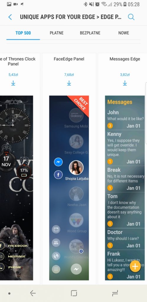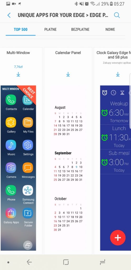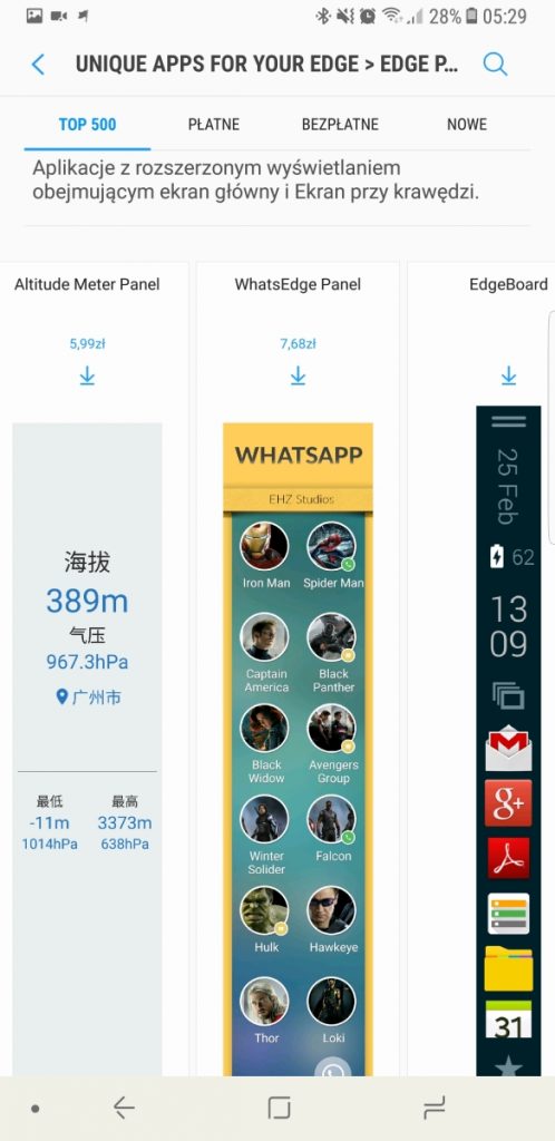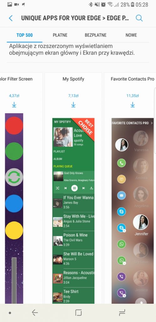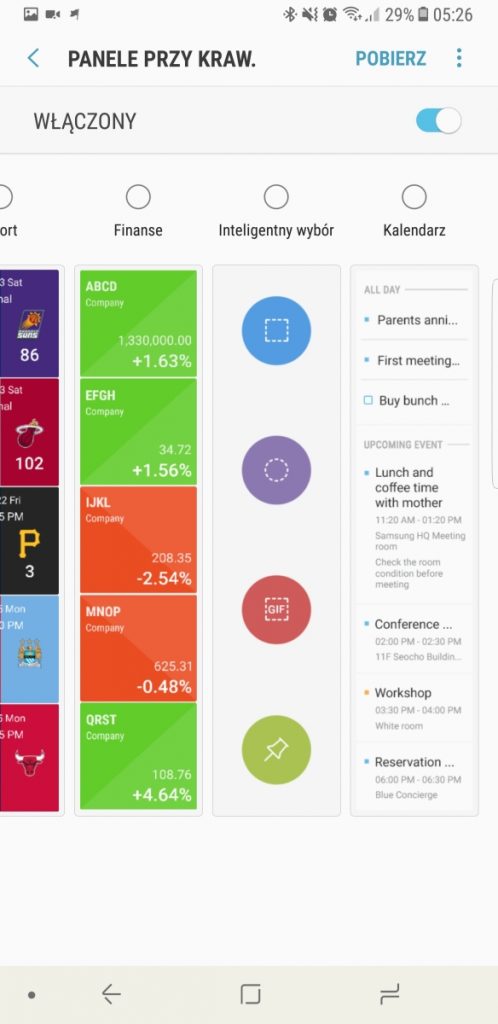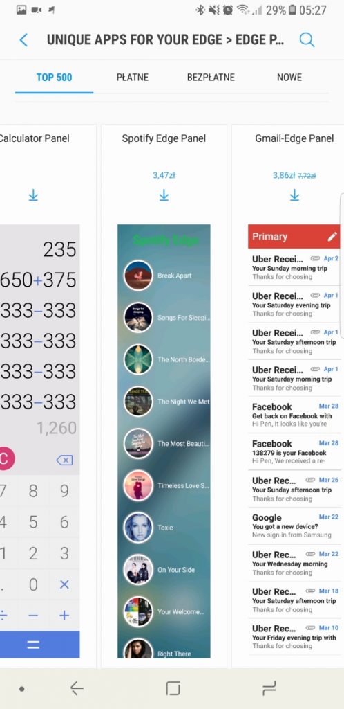 - Ekran przy krawędzi / Ekran krawędziowy – czyli wysuwany z prawej strony panel z podłużnym, pionowym paskiem, który oferuje dostęp do ulubionych kontaktów, kalendarza, notatek, widgetów pokazujących dane z giełdy, newsy, przypomnienia etc. W Galaxy Apps znajdziesz masę dodatkowych rozwiązań, które można tu umieścić. Należą do nich kompas, kalkulator, panel ze Spotify, dostęp do Ustawień, mikrofonu i nagrywania, aplikacji WhatsApp i wielu, wielu innych. Tutaj niestety są już one płatne. I jakkolwiek niekoniecznie wygodnie sięga się po każdą z tych apek w SGS8, tak już w Note8 prezentuje się to ciekawiej, a to za sprawą rysika, którym inaczej nawiguje się po systemie niż palcem, w związku z czym inaczej też trzyma się sam telefon w takich okolicznościach, a w tym wypadku Ekran przy krawędzi z sekcjami potrzebnych skrótów zaczyna sprawdzać się bardzo poręcznie i efektywnie.