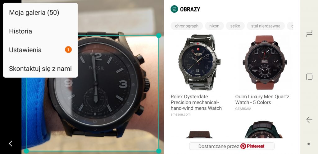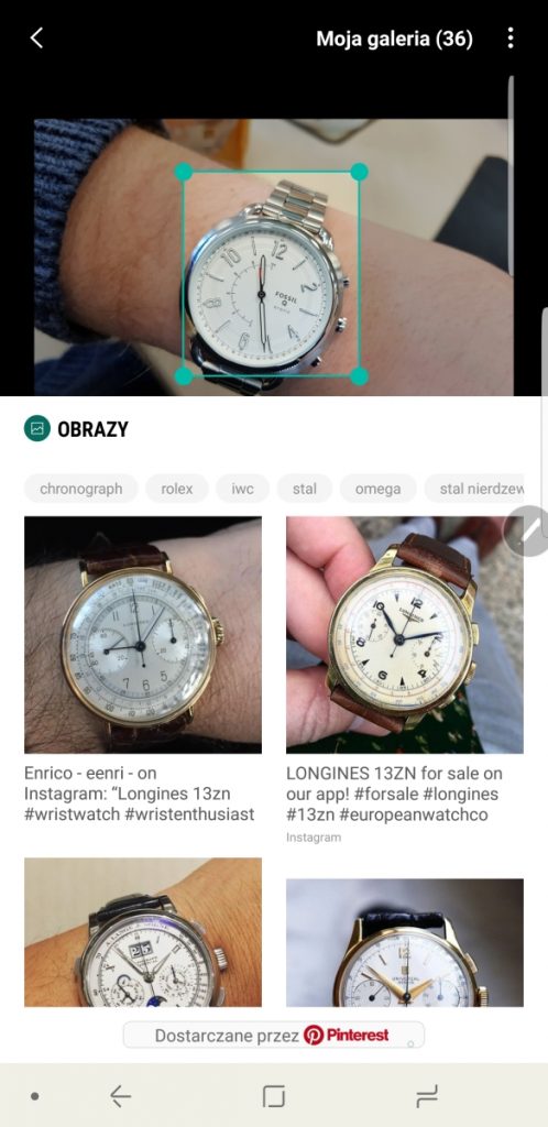 – Bixby Vision – pomysł świetny, realizacja taka sobie lub w zasadzie – mierna… W Galaxy S8 jeszcze tego tak nie odczuwałem, ale tutaj, kiedy rzeczywiście wskazujesz rysikiem, co ma być rozpoznane, pojawia się kłopot. Chodzi o to, że Bixby w miarę dobrze rozpoznaje przedmioty pod kątem ogólnego przypisania ich danej kategorii produktowej, ale jakoś w nie do końca inteligentny sposób robi z tej wiedzy użytek… Bo jeśli podsuwam jej czytelne zdjęcie zegarka, z równie czytelnym logotypem producenta, to dlaczego wymienia mi wiele czołowych firm zegarkowych oraz podsuwa zdjęcia modeli, które nie są tym, na którym mi zależy? Wymaga to jeszcze poprawy, ale zamysł jest dobry. Póki co nie broni się to jeszcze na sensownym poziomie, ale sądzę, że warto dać temu szansę.