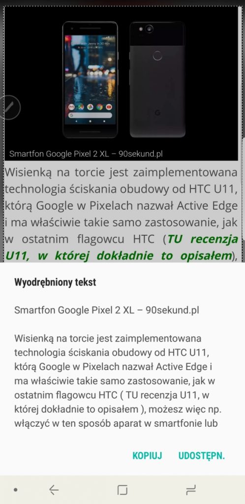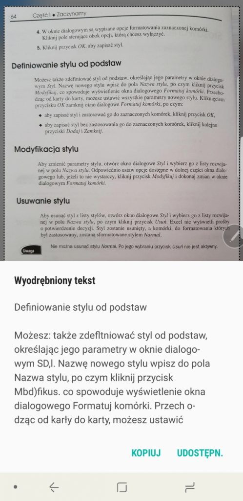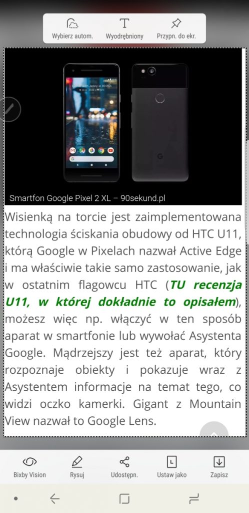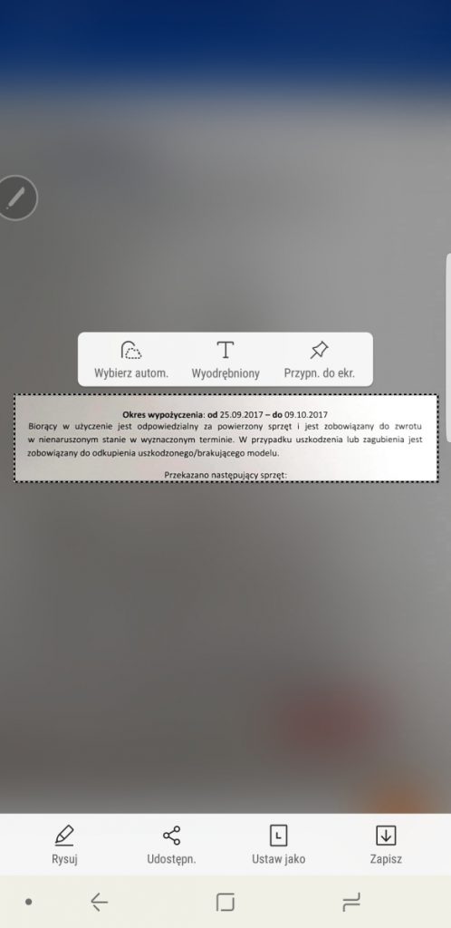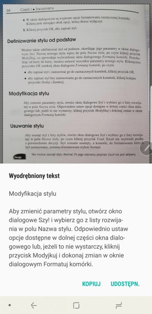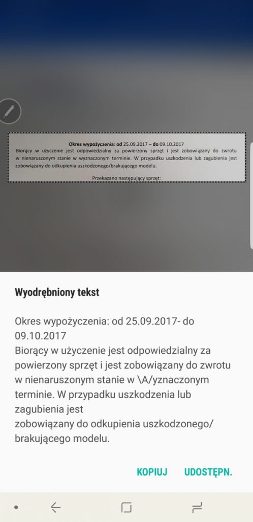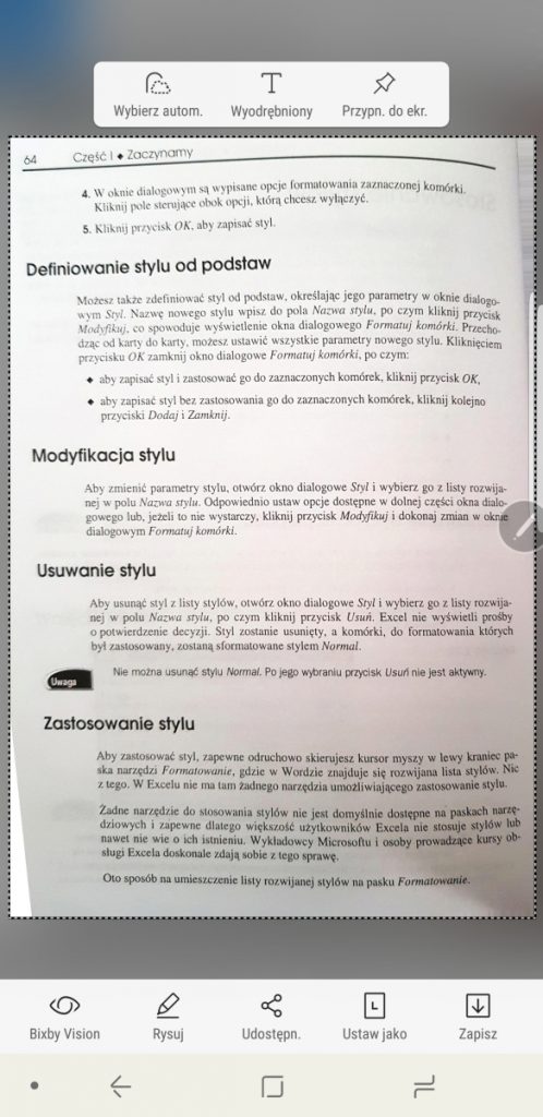 – Inteligentny wybór – świetna opcja, pozwalająca zakreślić dowolny obszar z grafiką oraz tekstem, następnie wyciągnąć albo ów grafikę, albo też sam tekst, udostępnić to, wkleić do Worda, Dokumentów Google, zapisać jako osobną notatkę w OneNote lub Keep etc. Dodatkowo opcja ta potrafi wycinać elementy z tła, więc jeśli obrazek zawiera szczegół, który chcesz wydobyć – jest to możliwe. Dla precyzyjnego zaznaczania i wycinania są różne warianty narzędzi – prostokąt, okrąg, lasso etc. Co ciekawe – możesz też wybrać tekst z jakiegoś dokumentu PDF. Zależnie od kroju czcionki narzędzie to radzi sobie raz lepiej a raz gorzej, ale jeśli studiujesz i masz np. do przepisania coś z książki w ramach cytatu do swojej pracy, to jest to idealne narzędzie do tego, aby się nie namęczyć stukaniem po klawiaturze.