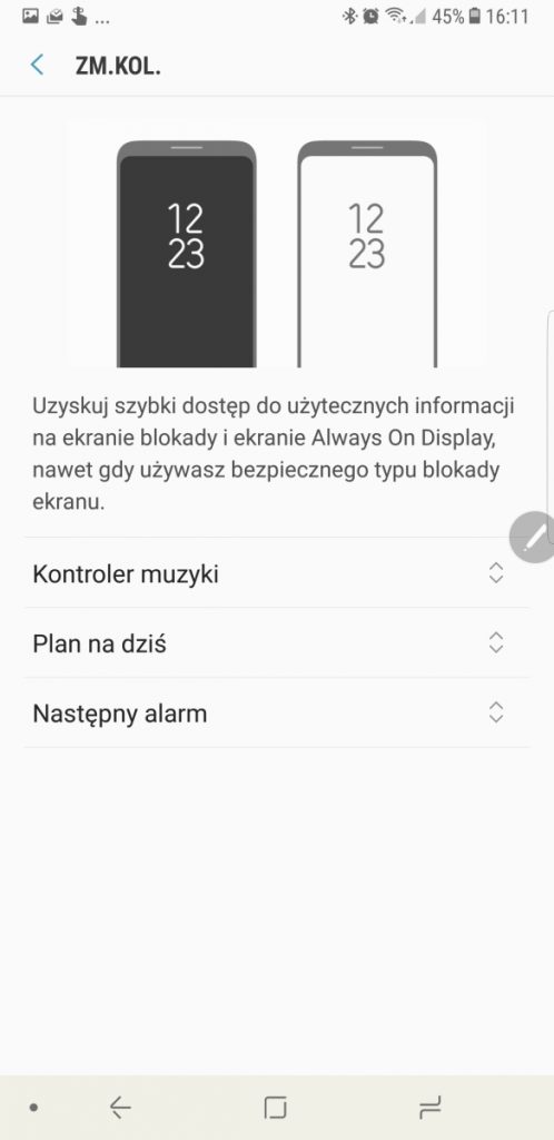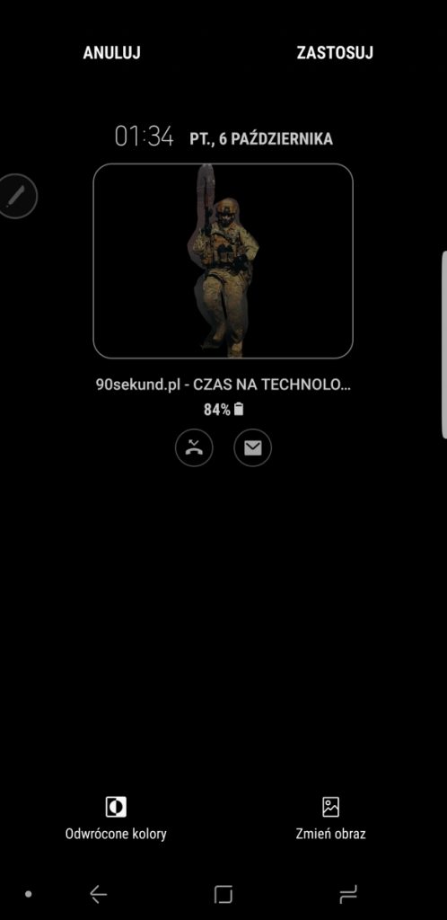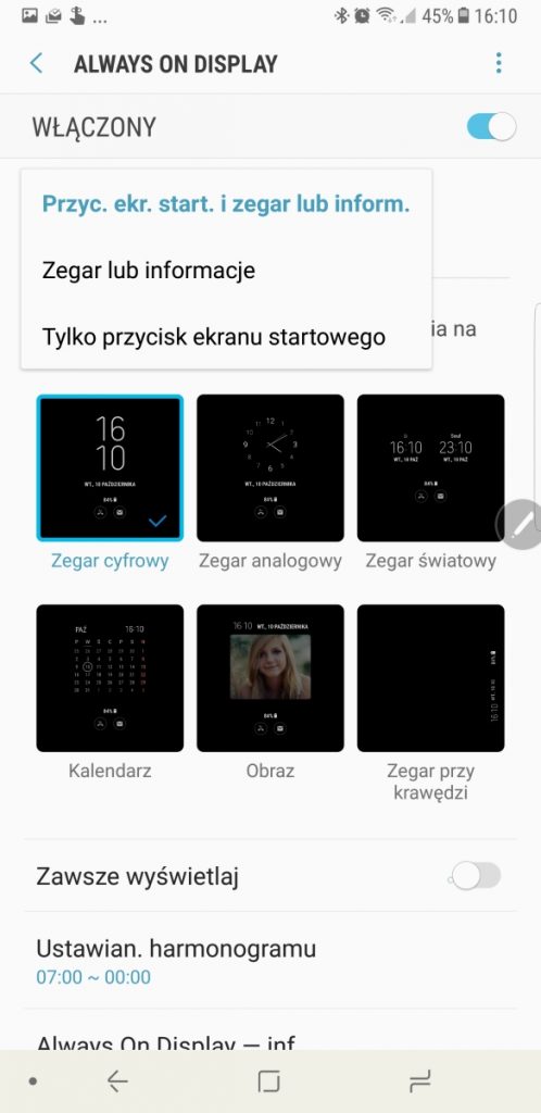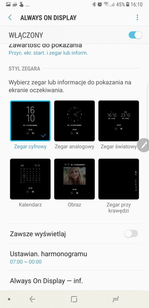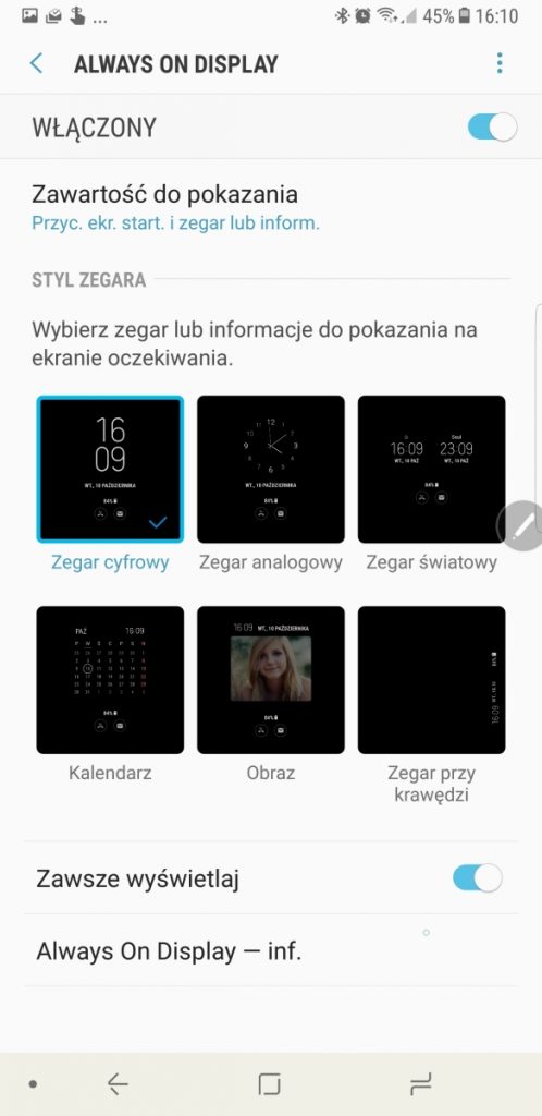 - Wyświetlacz Always-on-Display (AoD) – pokazujący na wygaszonym ekranie aktualną datę, czas i stan nieodebranych powiadomień, połączeń, wiadomości z najróżniejszych serwisów i kont, do których jesteśmy podłączeni. Można go personalizować i np. jako tło dodać wybrane z Galerii zdjęcie lub umieścić dowolny napis. Niestety – aby wejść w interakcję z powiadomieniem, trzeba już odblokować smartfona. Sądzę – jak już pisałem o tym przy recenzji SGS8 – że Samsung mógłby zapożyczyć patent od Lenovo, bowiem w jego Motorolach można bez niepotrzebnej aktywacji, z poziomu AoD i zablokowanego telefonu – podejrzeć powiadomienia, usunąć je, odpowiedzieć na SMS etc. Nie zmienia to jednak faktu, że w SGN8 działa to i tak bardzo dobrze, daje się z tego poziomu sterować np. słuchaną muzyką, a w sklepie Galaxy Apps jest cała masa motywów pod wyświetlacz Always-on-Display, co zwiększa jego atrakcyjność i konfigurowalność. Poza tym nie musi on działać, albo może tylko w zdefiniowanych godzinowo porach. Nie trzeba przy tym martwić się o zużycie energii, bowiem z uwagi na zastosowany typ ekranu, podświetlane są wyłącznie wybrane piksele odpowiadające za prezentowanie treści. Tutaj dodatkowo to świecenie nie jest intensywne, a cały panel właściwie pozostaje wygaszony.