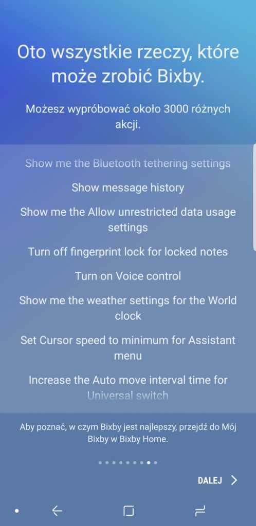 3. Na pulpicie po lewej stronie, znalazło się miejsce dla Asystentki Bixby. Niestety porozumiewa się z nami wyłącznie po angielsku, ale jest mocno zintegrowana z systemem, łącznie z wybranymi aplikacjami firm trzecich, więc pozwala np. na twittowanie lub zainstalowanie aplikacji ze Sklepu Play bez dotykania telefonu – wyłącznie głosem.