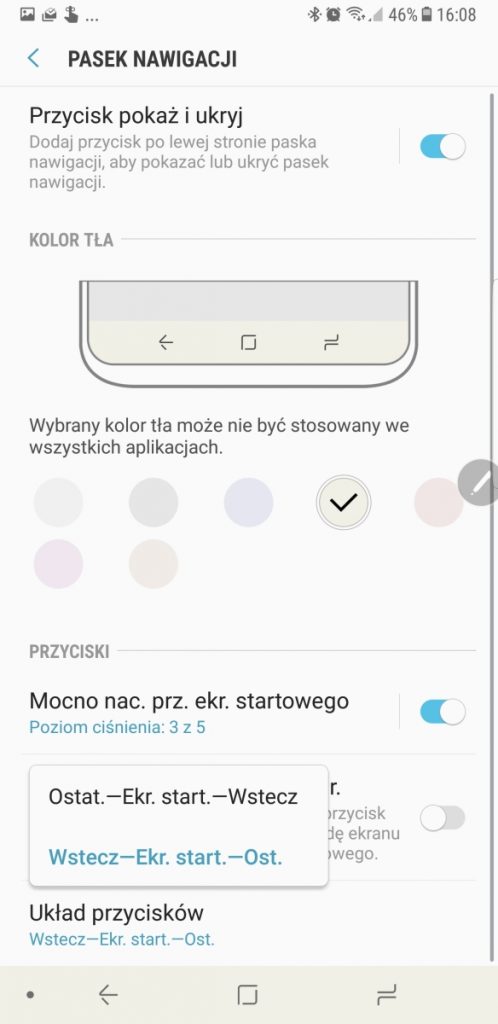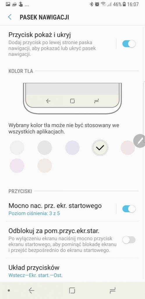 Jako, że nie ma już fizycznego przycisku domowego pod ekranem, bo wyświetlacz wypełnia właściwie cały front, toteż jest on teraz na ekranie. Ekranowe są też przyciski nawigacyjne, można tym paskiem zarządzać – zmieniać układ ów przycisków, kolor ich tła, siłę nacisku, na którą mają reagować. W każdej aplikacji pasek się chowa pod belkę dolnej ramki, ale łatwo jednym pociągnięciem palca go wysunąć. Dzięki temu za każdym razem jest szybko dostępny i za każdym razem równie szybko ukrywalny – jeśli już go nie potrzebujemy.