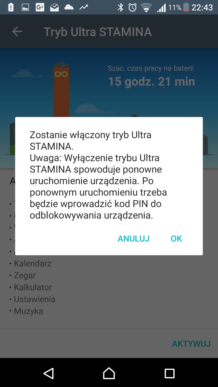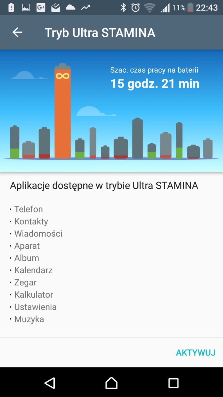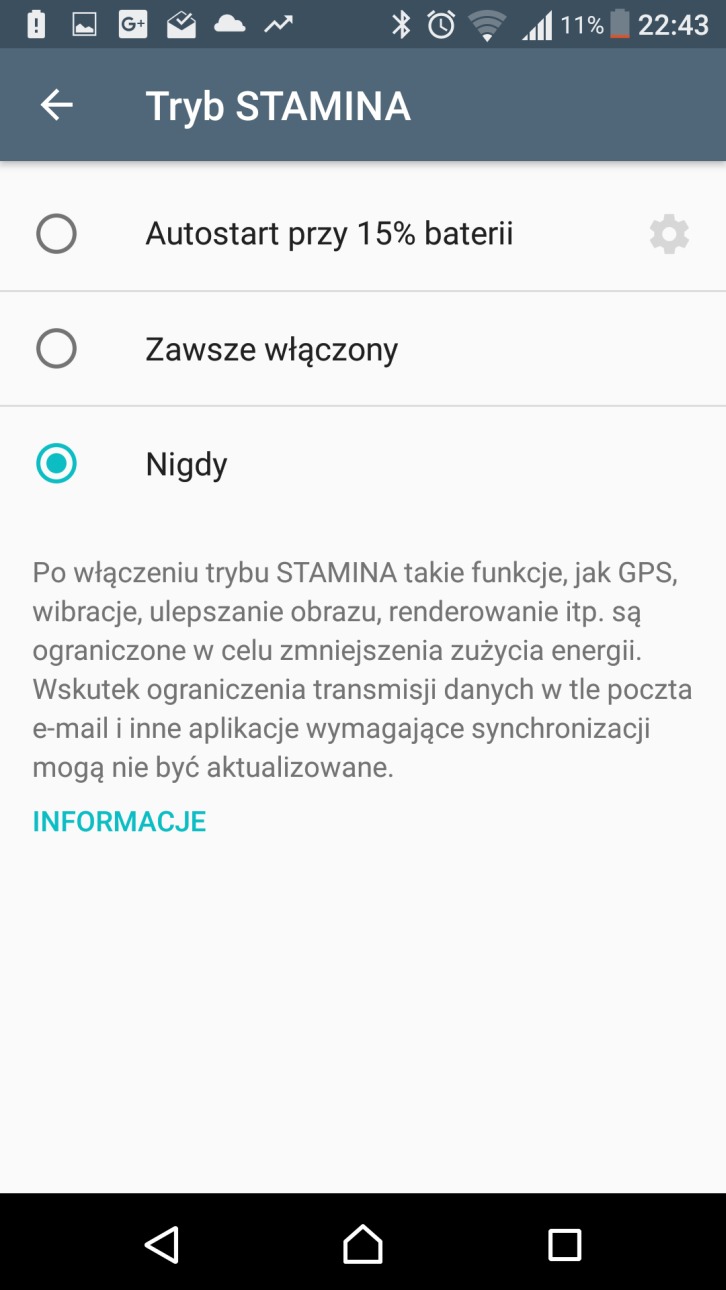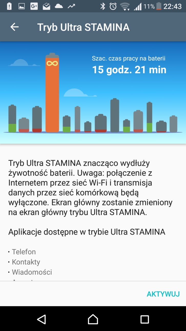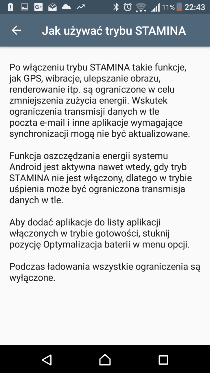 Sam proces ładowania – pomimo, że wyraźnie dłuższy niż np. Huawei Nexusa 6P z pojemniejszym akumulatorem – nie jest dramatyczny, więc całość finalnie sprawuje się naprawdę nieźle. W sytuacji, kiedy jest dramatycznie można sięgnąć po Tryb STAMINA. Poza tym – jeśli z jakichś powodów produkt musi pracować w Trybie Samolotowym, to zużycie energii jest właściwie żadne, no ale to są incydentalne momenty, bowiem kto korzysta z takiego produktu będąc offline?