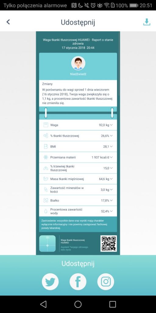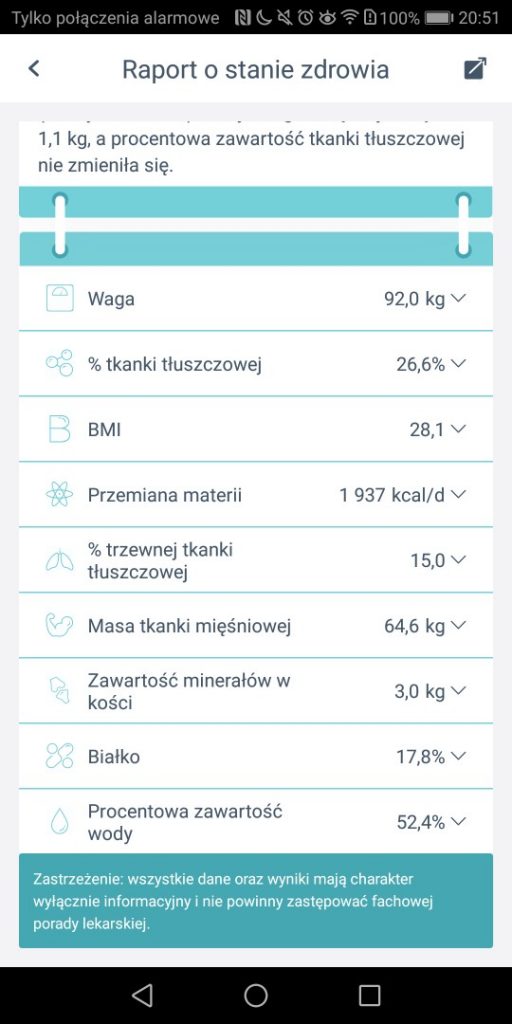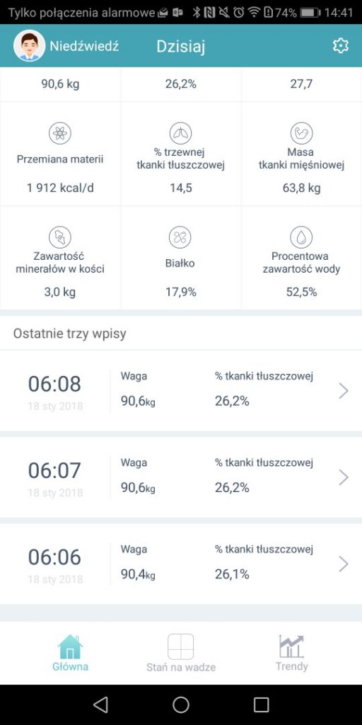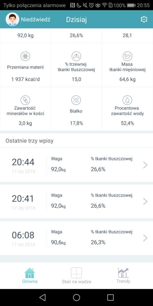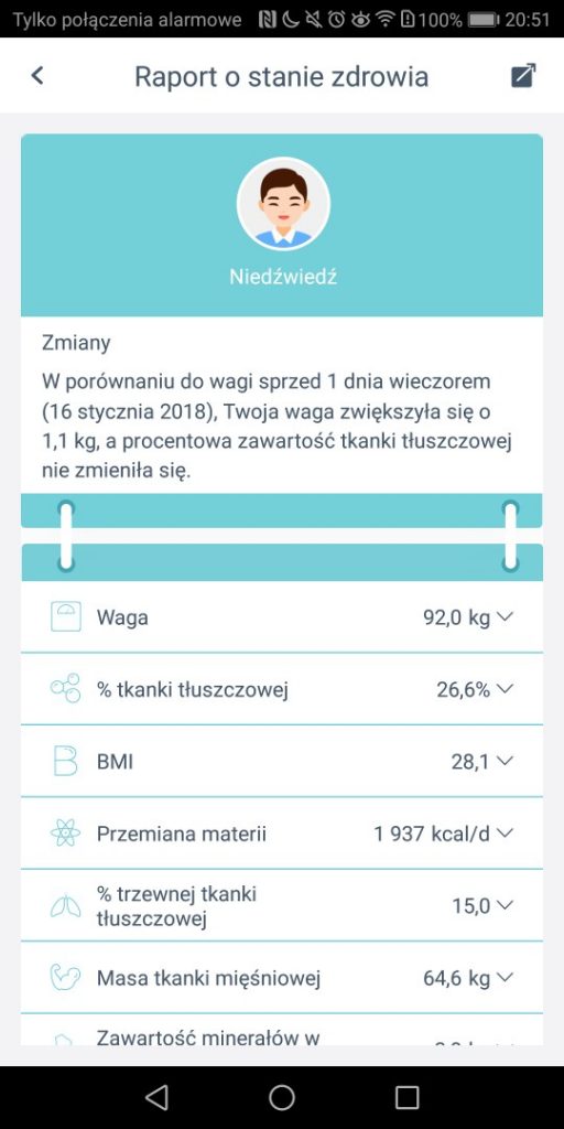 No, ale – patrząc pod kątem minusów – kto odsprzedaje wagę? Ten argument więc odpada. A skoro nie sprzedajemy wagi, tak smartfony już na pewno. A tak się składa, że dedykowana aplikacja nie posiada łączności z Chmurą, a to oznacza, że nie możemy wyeksportować zgromadzonych nań informacji. Boleśnie się o tym przekonałem, kiedy skończyłem testy Huawei Mate10 Lite (TU recenzja). Przywróciłem telefon do ustawień fabrycznych i odesłałem do producenta święcie przekonany, że kopia wszystkich ważeń, jest w Chmurze. Kiedy sparowałem wagę z nowym Huawei Mate10 Pro – który dojechał do mnie kilka dni później – okazało się, że tych danych po prostu nie ma…