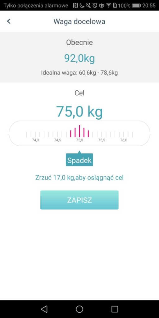 Warto też – zaczynając przygodę z opisywanym tu urządzeniem – zdefiniować, jaka waga jest naszym celem. Dzięki temu w estetyczny graficznie sposób, będziemy informowani, czy kilogramów nam przybywa, czy ubywa. Można to śledzić korzystając z aplikacji i dzieląc poszczególne okresy ważenia na dni, tygodnie, miesiące czy lata. Jest też opcja wyboru jednostek wyrażających zebrane dane: lbs/kg (funt/kilogram).