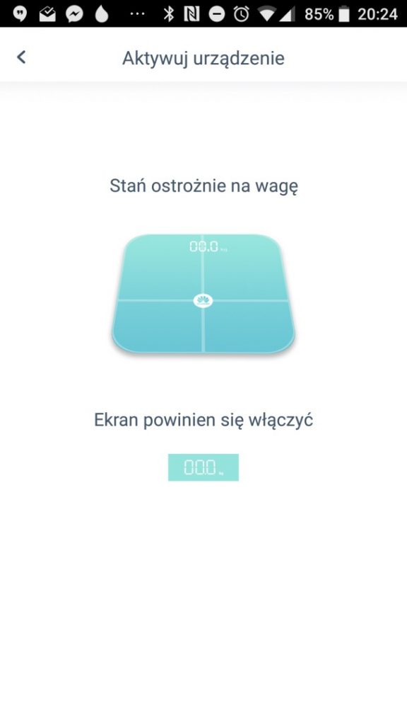 Aby zacząć przygodę z wagą Body Fat Scale, trzeba pobrać wcześniej ze Sklepu Play lub App Store aplikację o tej samej nazwie, która po instalacji będzie widniała w smartfonie pod polską nazwą Waga Tkanki Tłuszczowej Huawei (a przynajmniej będzie tak w wersji na Androida). Parowanie jest bardzo intuicyjne, a wskazania banalnie proste. Aby połączyć się z AH100 jesteśmy proszeni, aby stanąć na niej w odpowiednim momencie, a już po chwili poprzez łączność Bluetooth dochodzi do skojarzenia wagi z naszym smartfonem. Nie ma więc ryzyka, że ktoś inny się z nią połączy. A nawet gdyby, to… ujawnia się tutaj druga wada, którą wyłapałem.