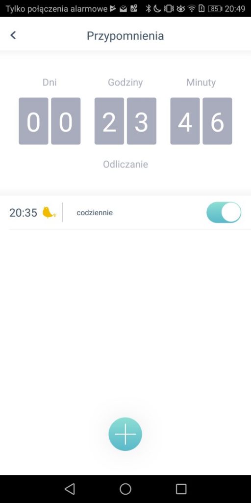 Waga posiada wyświetlacz w swojej górnej części. Jest on niewidoczny i pokazuje się dopiero, kiedy staje się na AH100. Sama Body Fat Scale jest aktywna przez 30 sekund, a kiedy po tym czasie nie wykrywa aktywności – przechodzi w stan niskiego poboru energii. Nie można jej więc definitywnie wyłączyć. Ma to akurat swoje znaczenie, gdyż można ustawić sobie dowolną ilość przypomnień o ważeniu i wówczas waga informuje nas o nich alarmem dźwiękowym. Szkoda, że nie wyświetla się osobne powiadomienie na smartfonie, bo przez kilka dni – zupełnie serio – zastanawiałem się, co mi tak pika w mieszkaniu(?) i zlokalizować źródła sygnału nie mogłem.