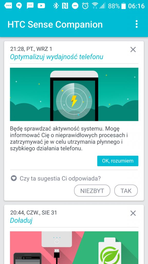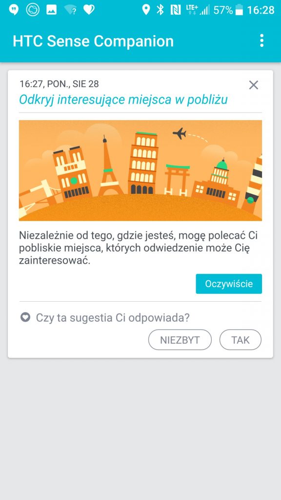 Ostatni dodatek od HTC, to oparta o sztuczną inteligencję usługa Sense Companion. Nie jest to jednak tak innowacyjne rozwiązanie, jak Samsung Bixby czy Alexa od Amazonu, chociaż w U11 i na tą ostatnią postawił HTC. Natomiast sam Companion bardziej podsuwa proste porady i przypomnienia, aniżeli rzeczywiście zasypuje nas pomocowymi rozwiązaniami. Sporo czasu też trwa, zanim w ogóle da o sobie znać i robi to tak sporadycznie, że… mogłoby HTC Companion nie być. Czekam na rozwój sytuacji, ale nie zdziwiłbym się, gdyby po prostu – w świetle ostatnich przejęć – Tajwańczycy postawili całościowo na Asystenta Google. Czas pokaże.