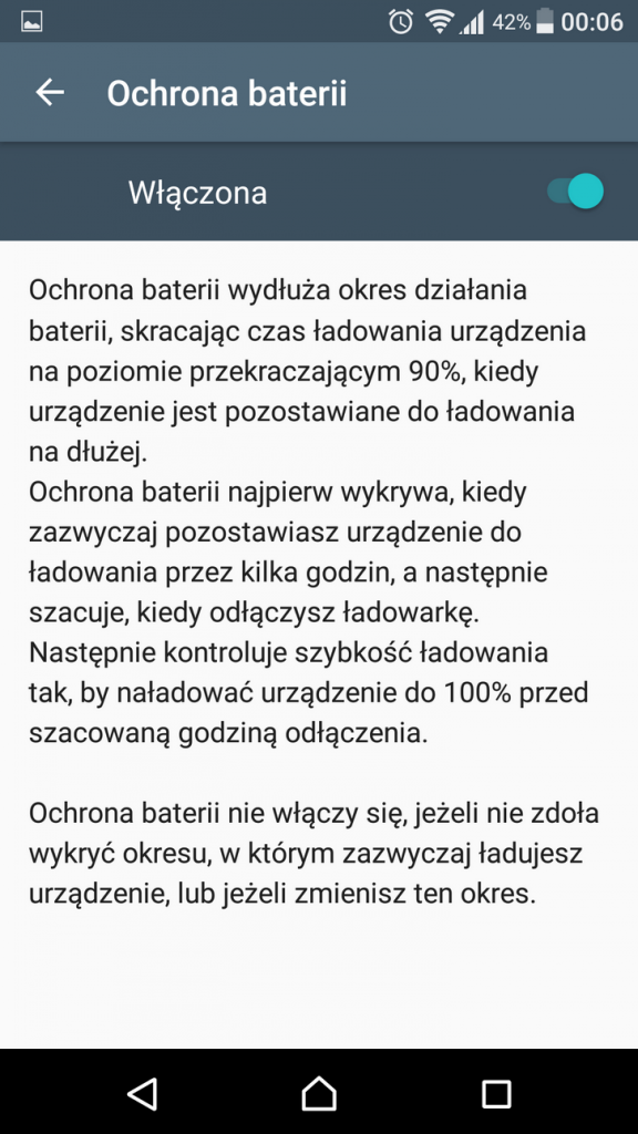 Otóż Sony nazywa to intuicyjnym ładowaniem. Polega ono na tym, że smartfon wie, kiedy masz nastawiony budzik, więc ładuje się do 90 procent, a potem adekwatnie do godziny i czasu napełnia baterię do 100 procent, tym samym będąc gotowym na chwilę przed budzeniem. Muszę przyznać, że jest to świetne rozwiązanie, tym bardziej, że zdecydowana większość smartfonów nie daje już dostępu do wymiany baterii. Mi to osobiście nie przeszkadza, nigdy na szczęście nie musiałem kupować nowej w żadnym ze smartfonów, ale są osoby, które to robią właśnie m.in. przez zużycie ogniwa. Sony dba o to, by akumulator mimo wszystko był jak najdłużej w dobrej kondycji i tak samo wydajny, jak na początku swojego życia.