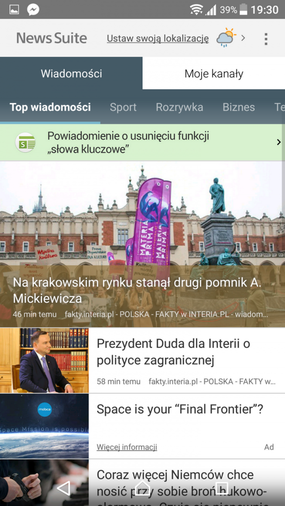 New Suite, czyli Wiadomości – aplikacja, która zbiera najistotniejsze informacje ze świata z najróżniejszych kategorii. Oczywiście, możesz ją odpowiednio spersonalizować pod siebie, dodając ulubione strony. Gdy tylko wydarzy się coś istotnego, dostaniesz również powiadomienie, tak więc zawsze dzięki tej aplikacji wiadomości masz z pierwszej ręki. Jest do dobry odpowiednik samsungowego Upday, choć dla mnie mniej czytelny, no i nie redagowany przez żywych redaktorów.