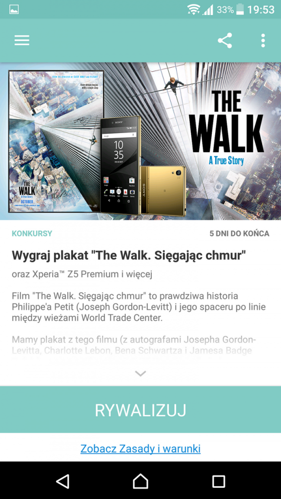 Generalnie jest w Loiunge wszystko i nic. Wiadomości często się powielają, brakuje także prawdziwych rarytastów, na przykład półrocznej substrykcji do Spotify, z którym Sony przecież współpracuje. Takich rzeczy tu niestety nie znajdziesz. W zamian za to Sony kusi Cię m.in. darmowymi motywami…, albo zachęca do udziału w konkursie, gdzie można wygrać filmowy plakat. Może jestem rozpieszczony przez Samsunga, ale niestety Japończycy muszą się jeszcze dużo nauczyć. Idzie to w dobrym kierunku, ale to jeszcze nie to.